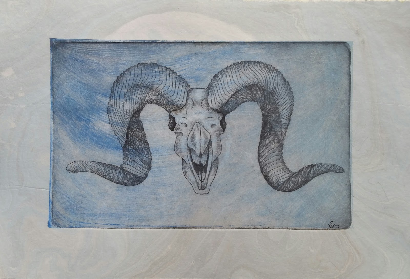 Meanwhile I continued working on other projects, some successful, some not so much. One of these happened to be a print of an argali sheep skull I did at the beginning of this year, a print I considered unresolved. I had never intended the print to be a straight intaglio work, and had originally tried some chine colle effects with the skull to bring some additional color and texture to the work, but I wasn't happy with the results. Like the monotypes, I put the plate away in storage until I could figure out what to do with it later.