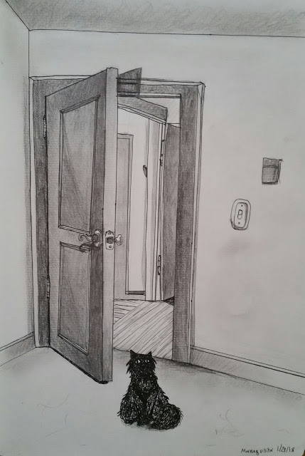 Sometimes Gustave takes a more subtle approach to his staring, as is the case in this drawing. In this reversal from the last sketch, I'm now looking out from the study, while he's the one in the hallway. I only saw half of his face this time, but it was enough to make his presence known. As with all the previous sketches, the play between light, shadow, and reflected light especially intrigued me, all interrupted by Gustave's opaque black fur and gaping eye.